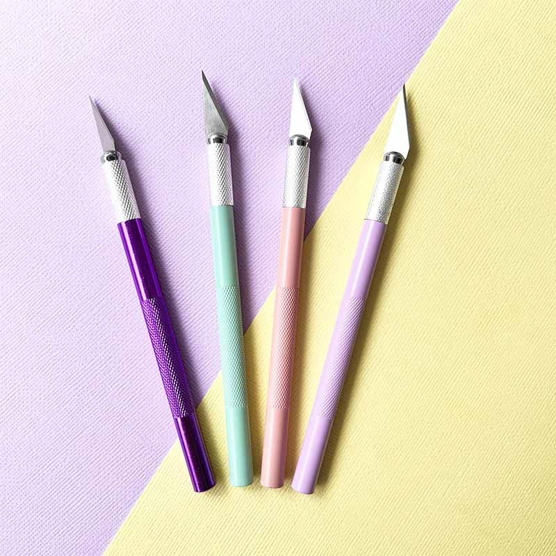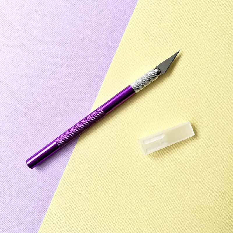 Este bisturí exacto de punta de lanza en color morado está diseñado para ofrecer la máxima precisión en tus proyectos de papelería creativa. Su manija con diseño antideslizante en hermosos tonos no solo es ergonómica, sino que también proporciona un agarre firme y seguro durante su uso.