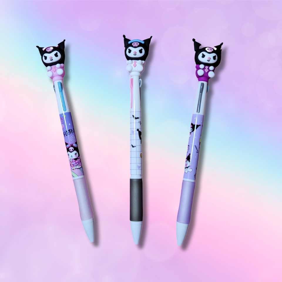 Un esfero de 3 minas de Kuromi es un bolígrafo multifuncional que se destaca por su adorable diseño inspirado en Kuromi, un personaje de Sanrio. Este bolígrafo permite cambiar entre tres colores de tinta diferentes, lo que lo hace muy práctico para tomar notas o decorar tus apuntes.