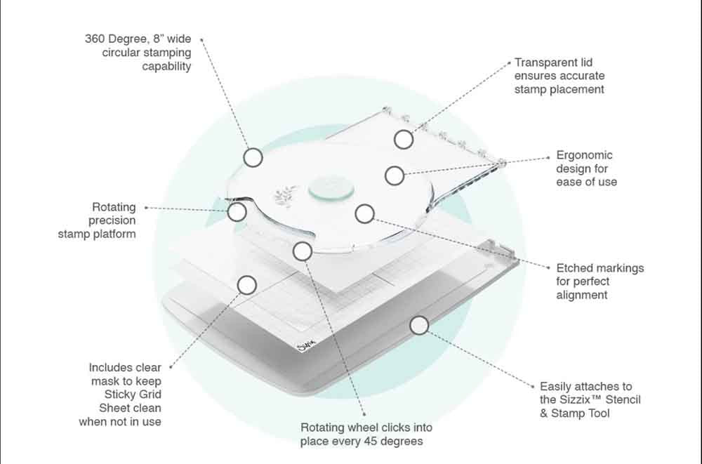 Este nuevo accesorio imprescindible para estampar es el complemento perfecto para la herramienta Stencil & Stamp, ¡ofreciendo aún más oportunidades de creación para los amantes de los sellos!, ofreciendo a los creadores la posibilidad de crear diseños circulares continuos con sellos.