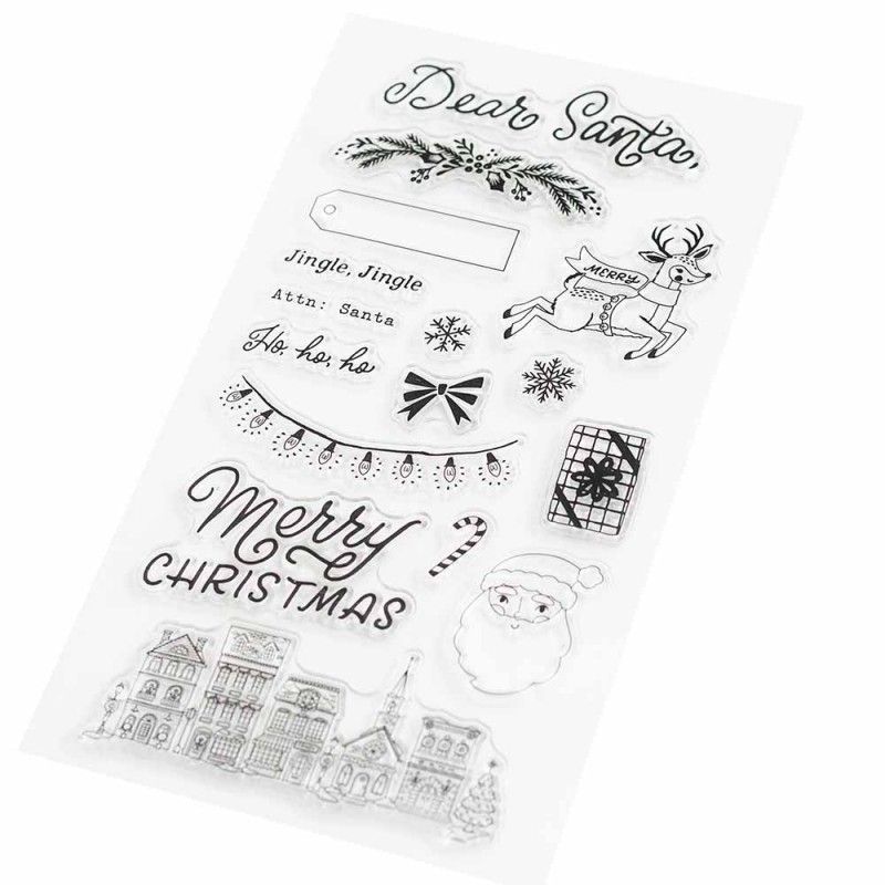Este juego de sellos de 16 piezas es parte de la coleccion Busy Sidewalks de Crate Paper and American Crafts. Estos sellos se adhieren a bloques acrilicos y se pueden usar con sus tintas, polvos de embossing y otros medios de artesania favoritos (se venden por separado). Este set incluye frases como Querido Santa, Feliz Navidad y mas. Hay un reno, copos de nieve, un regalo, Papa Noel, un paisaje urbano y mas. Estos sellos se pueden utilizar para tarjetas, albumes de recortes, etiquetas, diarios y otros proyectos de elaboracion de papel navideño.